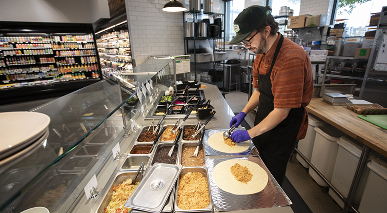 A commitment to environmental stewardship extends to other day-to-day operations. Aiming to be a zero-waste operation, the Co+op donates food products nearing their sell-by date to local organizations and people, including staff. Food scraps from the deli go to local farms to be composted.