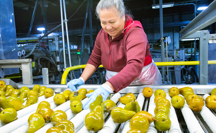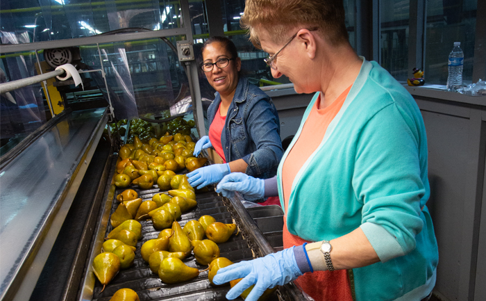 Pear packers gear up for their shifts like marathon runners, stretching and warming their muscles. A physical therapist visits once a week and promotes exercises and proper lifting. A health nurse also comes every Wednesday and counsels employees on physical and mental health.