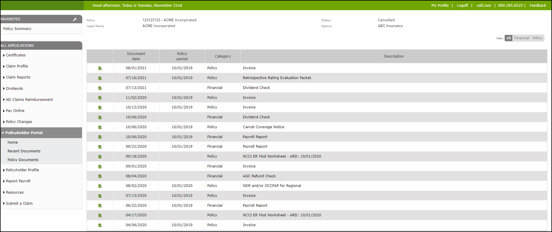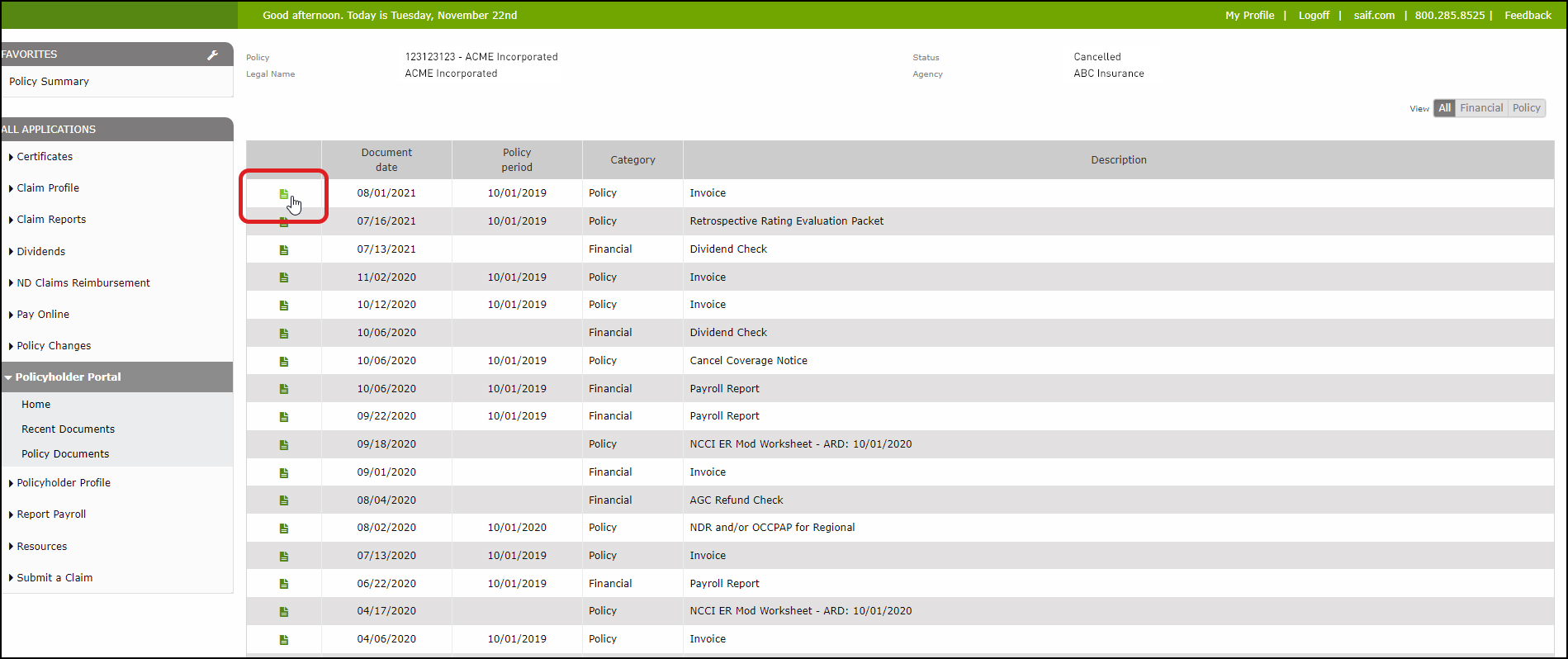 - Here you will see various policy documents such as your invoice, payroll report, issuance contract, etc. organized in a table, with one document per row. For each document, the table shows the document date, policy period, category, and description.