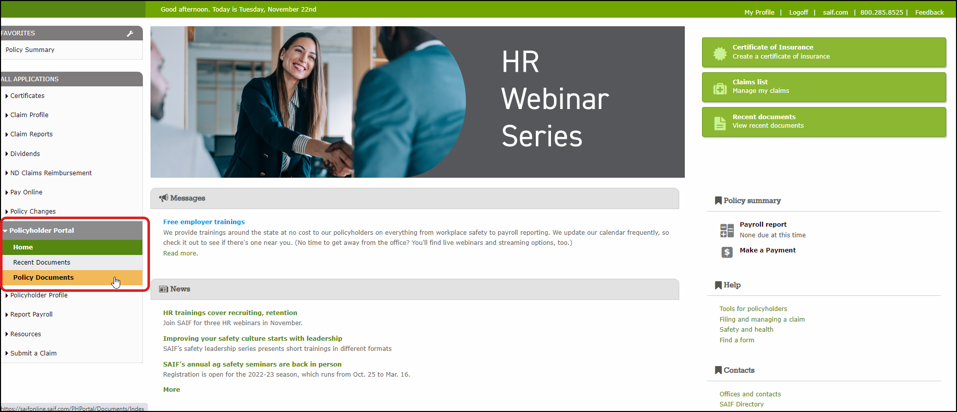 - Located on the left menu bar under Policyholder Portal, click Policy Documents.